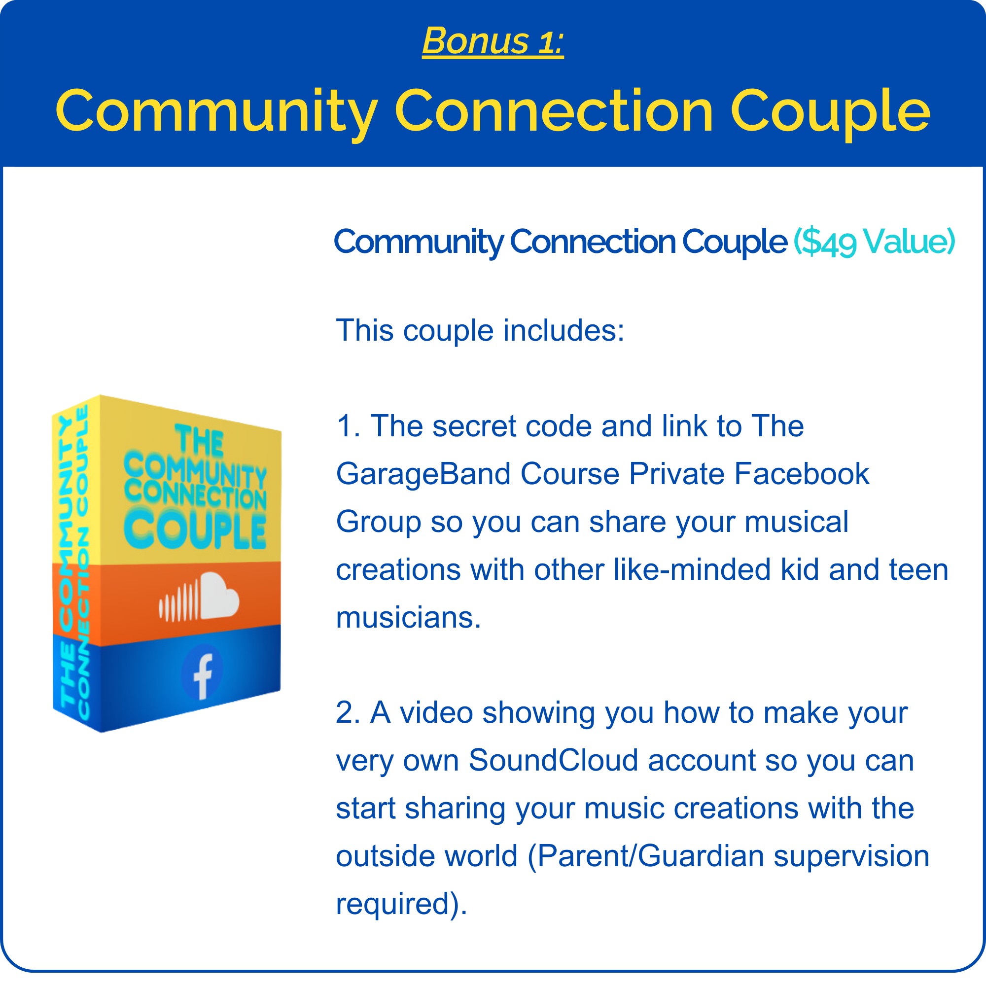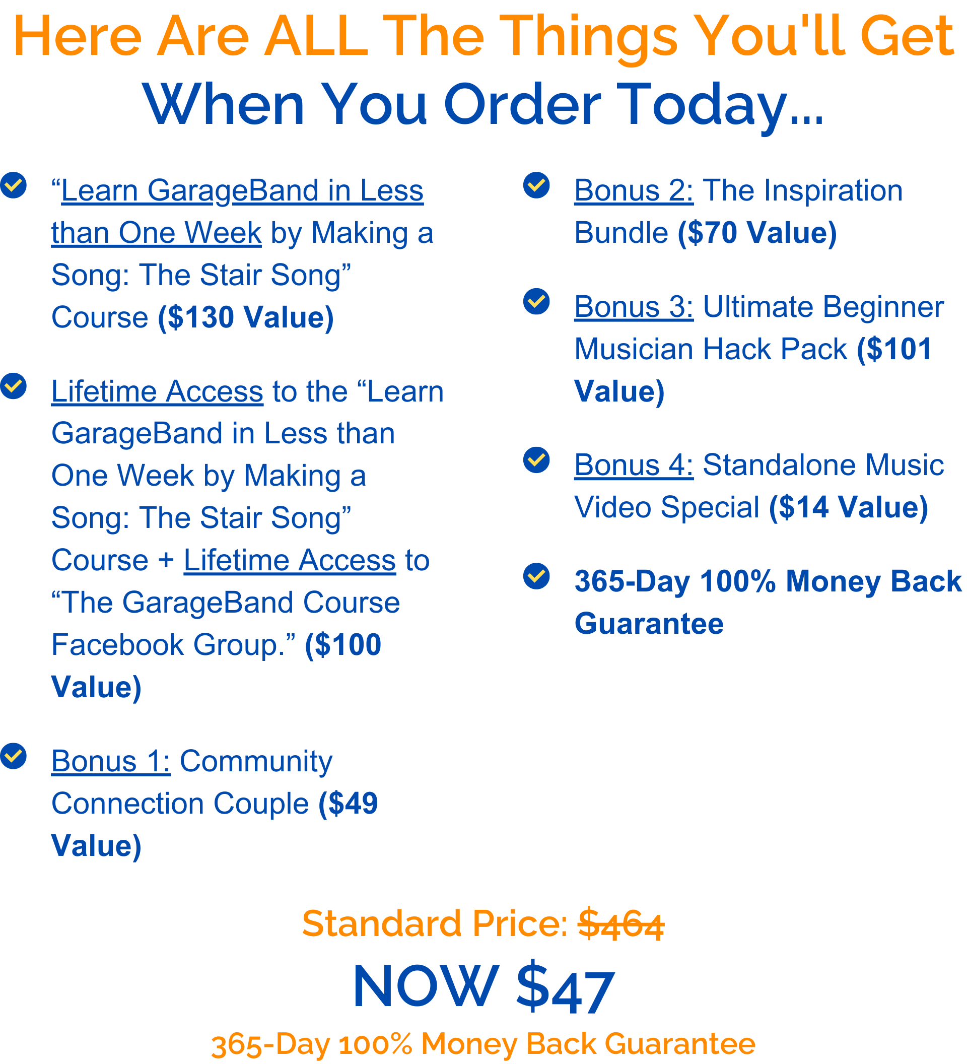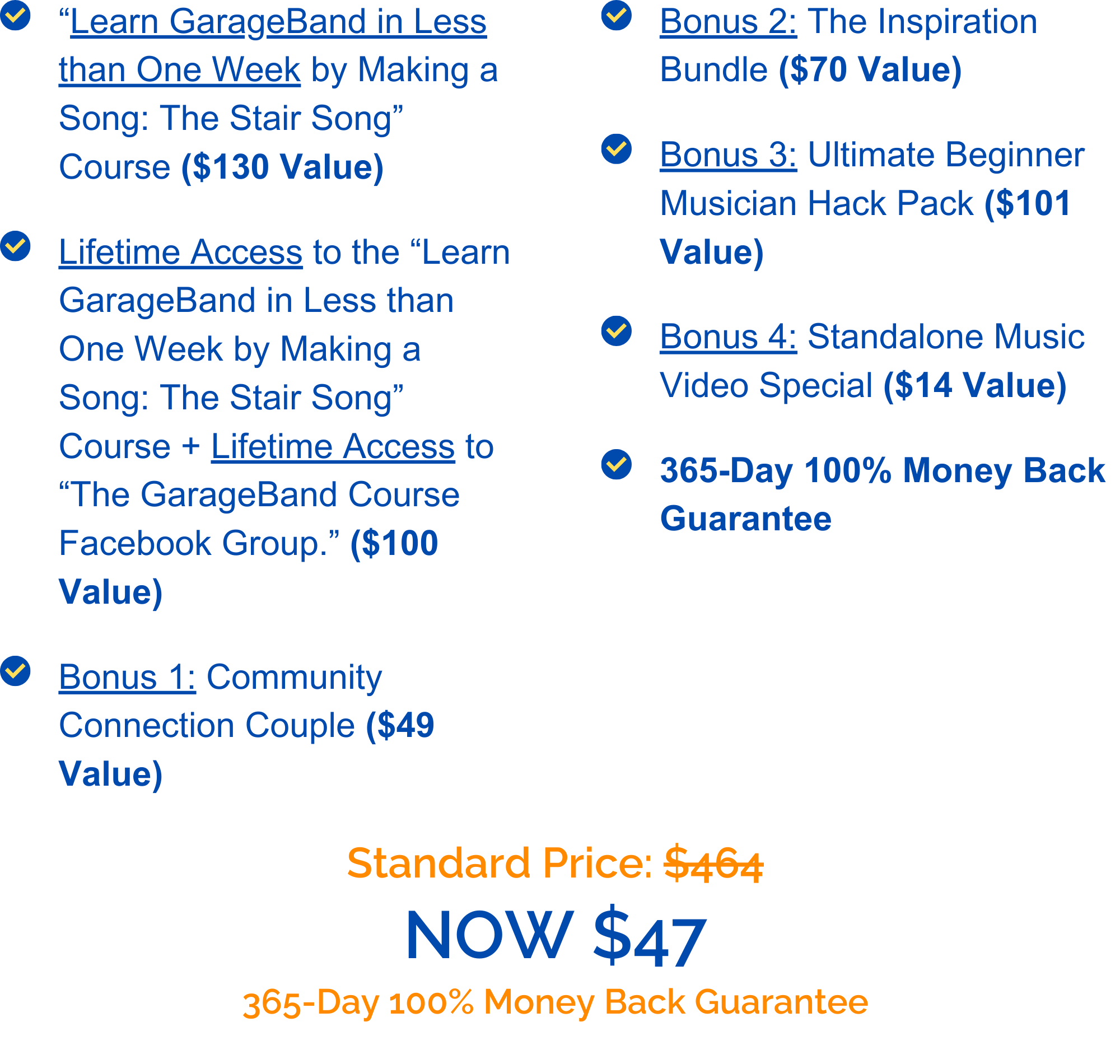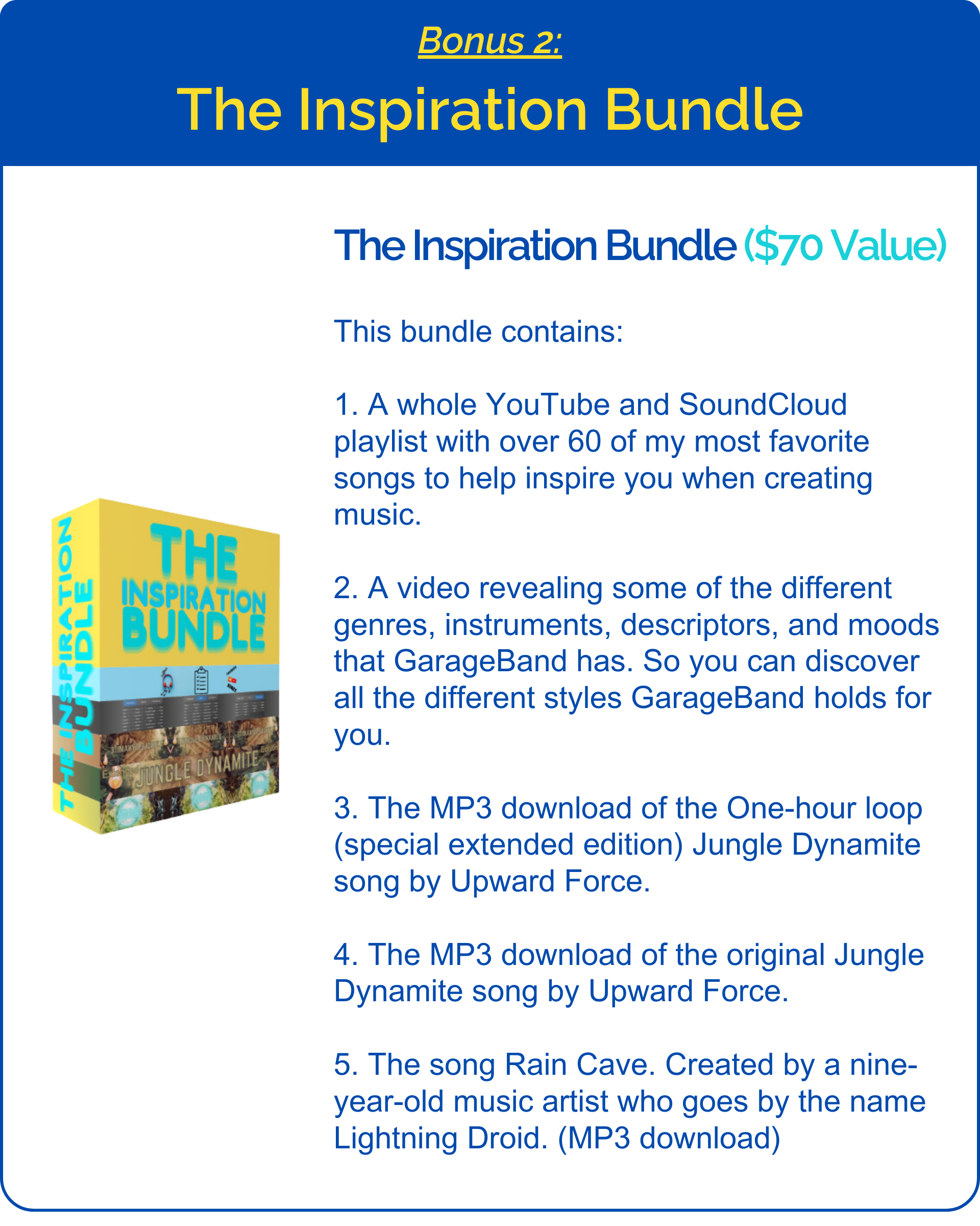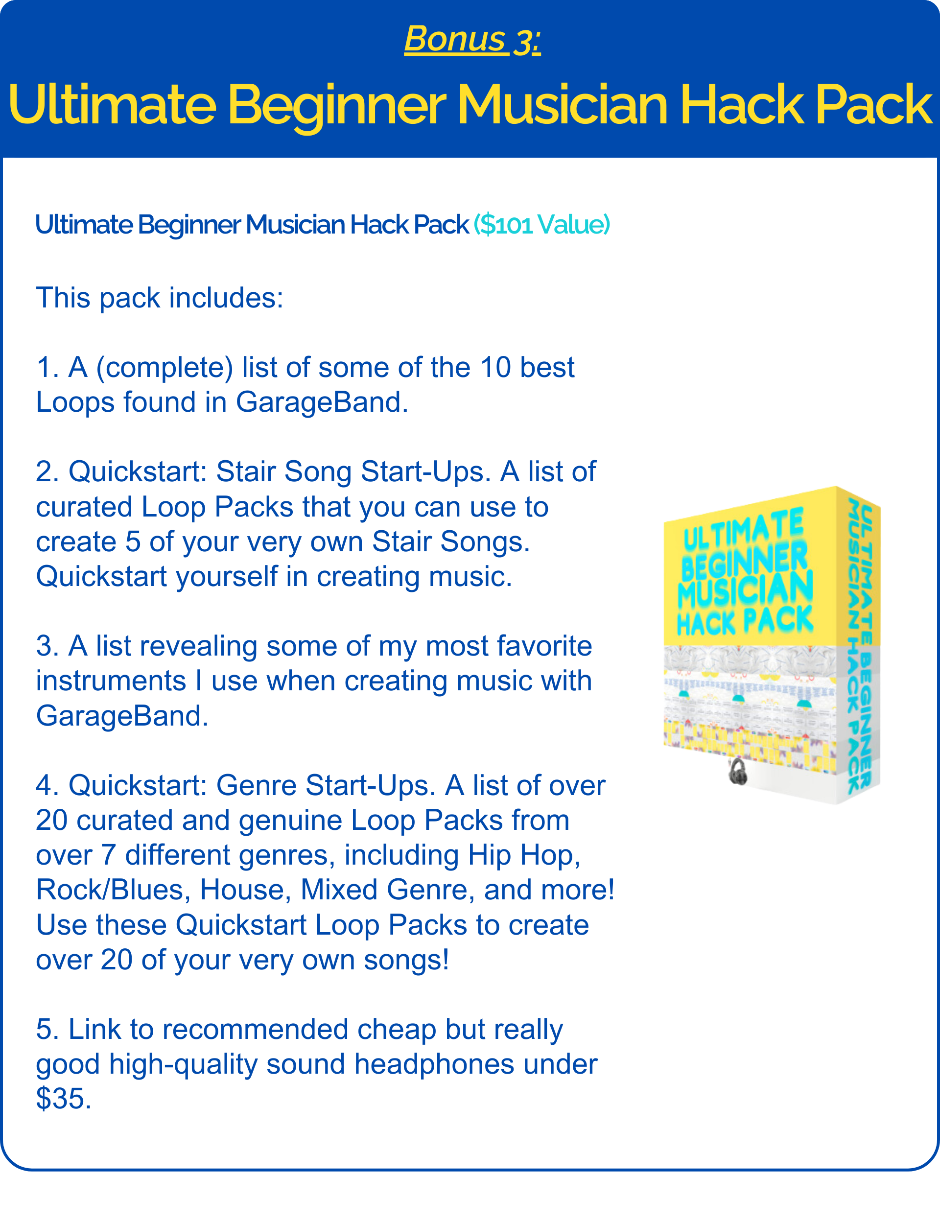 Plus, then to quickstart you into creating music all on your own, I give you multiple lists of GarageBand Loops (Loops; audio files of all kinds of instruments and sounds playing different tunes and melodies. Including drum beats, piano melodies, guitar riffs, jingles, you name it!) that sound good together that you can put together any way you want to create your very own songs all on your own!